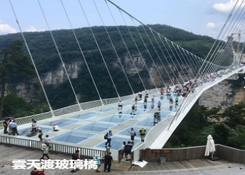 【雲天渡玻璃橋】位於湖南省的張家界大峽谷景區栗樹埡和吳王坡區域內,為一座景觀橋樑,兼具景區行人通行、遊覽、蹦極、溜索、T台等功能。主跨430米,一跨過峽谷,橋面長375米,寬6米,橋面距谷底相對高度約300米。這座全透明玻璃橋長度、高度位居世界第一玻璃橋建成後,將成為世界首座斜拉式高山峽谷玻璃橋;並創下世界最高最長玻璃橋、首次使用新型複合材料建造橋樑等多項世界之最。
