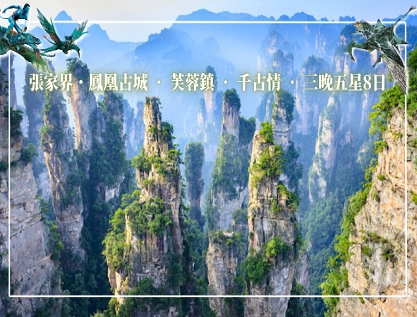張家界→古丈【紅石林國家地質公園、揚子古海、天池、紅石林峽谷】 →鳳凰【鳳凰古城(含古城接駁車+古城三景聯票-船遊沱江、沈從文故居+萬壽宮、虹橋、吊腳樓、鳳凰古城夜景】