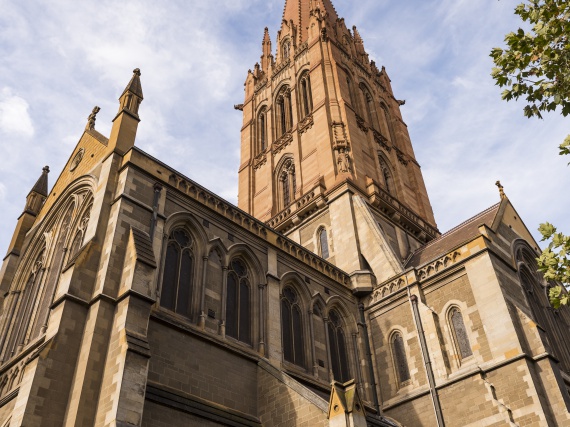 聖派翠克大教堂位於墨爾本市區,旁邊就是派翠克公園,堪稱南半球最大最高的天主教堂。教堂於1897正式啟用,但上方的三座哥特式尖塔直到1939年才完成,以紀念羅馬天主教會在維多利亞州傳教一百年。教堂由青石築成,外牆立面起伏凹凸,顏色深灰偏黑,莊重大氣、宏偉醒目,裝潢華麗但不失莊嚴,充分展現了文藝復興的建築風格。