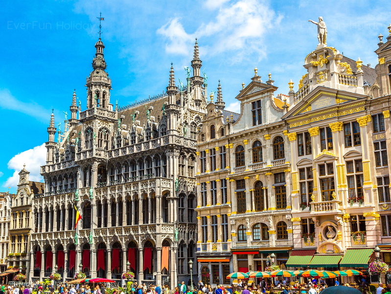 歐盟的首都布魯塞爾,是中世紀時因商業貿易而興起的城市,故黃金大廣場上皆是古時每個行業的行會,金碧輝煌,雄偉壯闊,法國大文豪維克多‧雨果稱之為歐洲最美廣場。廣場兩側最引人注目的是90公尺高的市政廳高塔和展示著來自世界各地贈送的尿尿小童衣裳的國王之家。