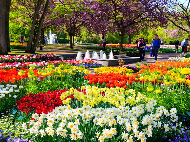 每年春天,庫肯霍夫公園就變成了一場視覺的饗宴。上百萬的鬱金香和其他球莖花卉爭奇鬥豔。錯落有致的花色迎面而來,鬱金香與其他球莖花卉佈滿80公畝大的土地,展現傳統和現代的景觀園藝。 ● 花卉所綻放的時間取決於氣候、溫度、雨量,實際景緻依當團時令狀況而有所不同。