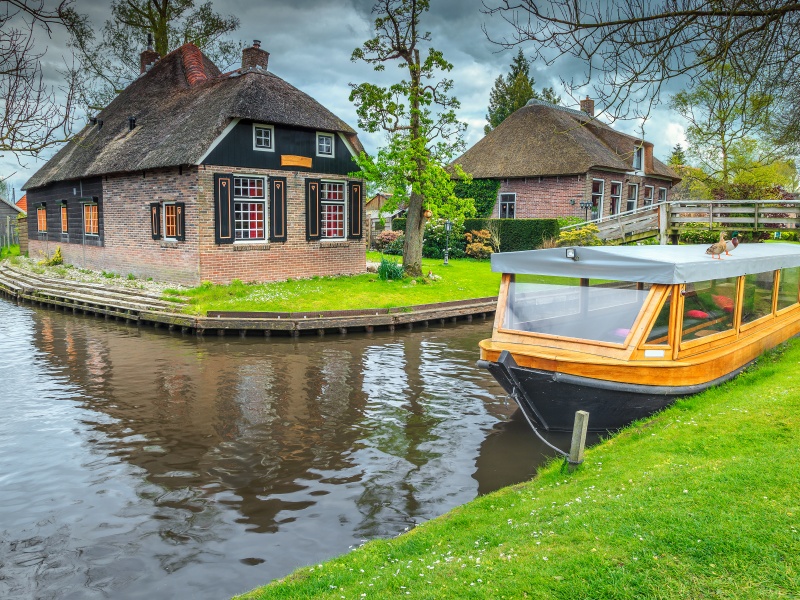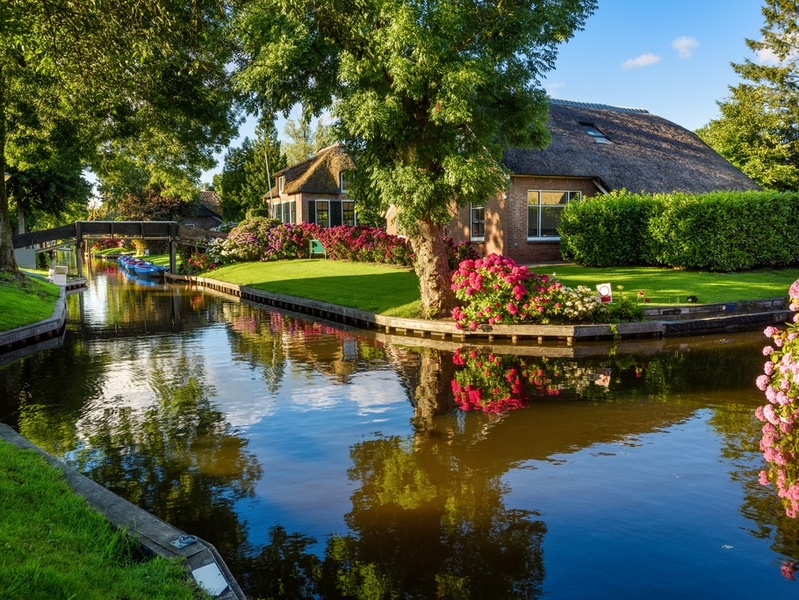 有綠色威尼斯之稱的羊角村,是由蘆葦屋頂小房子、小溪流及小木橋編織成一片美麗景色的水鄉澤國。被水道環繞的每間房屋,都擁有主人精心整修的庭院,宛如童話世界。 此地土壤貧瘠且泥炭沼澤遍佈,除了蘆葦之外其他植物不易生長,唯一的資源是地底下的泥煤。當地居民為了挖掘出泥煤塊賣錢而不斷開鑿土地,形成一道道狹窄的溝渠,然後建造小屋,因為生活貧苦而就地取材使用蘆葦編織成屋頂,冬暖夏涼防雨耐曬。之後為了使船隻能夠通過、運送物資,而將溝渠拓寬,形成今日運河湖泊交織的美景,號稱是荷蘭最美麗的村落。
