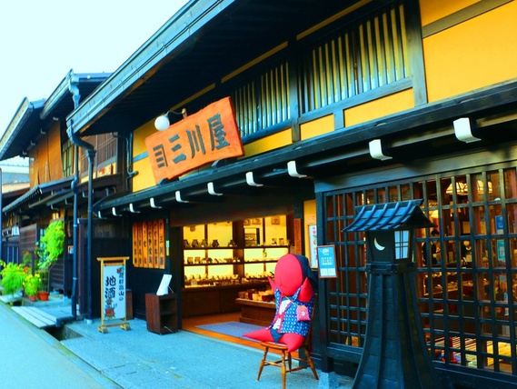 昔時商家聚集的城下町中心之三町,均保存其傳統古宅,有小京都之美稱;一長排細方格屋簷下,小水溝流水潺潺,造酒屋前掛著杉葉球的酒林,百年老店比比皆是,充滿著情趣的舖子鱗次櫛比,各式各樣的傳統陶瓷手工藝品、餐廳、喫茶店應有盡有,靜靜等候您觀賞品味,您可充份感受淳淳古風典雅情懷,時光彷彿停止了流轉,直讓人流連其中不捨離去;如時間允許您自費參觀高山城主金森氏的別墅【高山陣屋】。這座國史跡設於大正14年,是日本全國唯一郡代遺留下來的奉行所,可從內部間室的設計榻榻米上的花紋,看出當時階級上的分野。