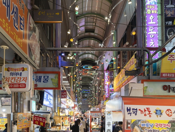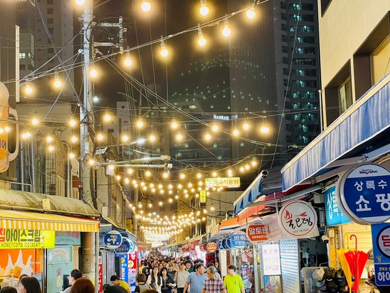 海雲臺市場鄰近海雲臺海水浴場,是避暑觀光客必訪地之一。在此可四處遊覽並享受購物的樂趣,不僅有各種新鮮便宜的蔬菜、肉類與魚貝類,還有飯捲、辣炒年糕等各式各樣的美食,以及豐富的生活雜貨,令人流連忘返。