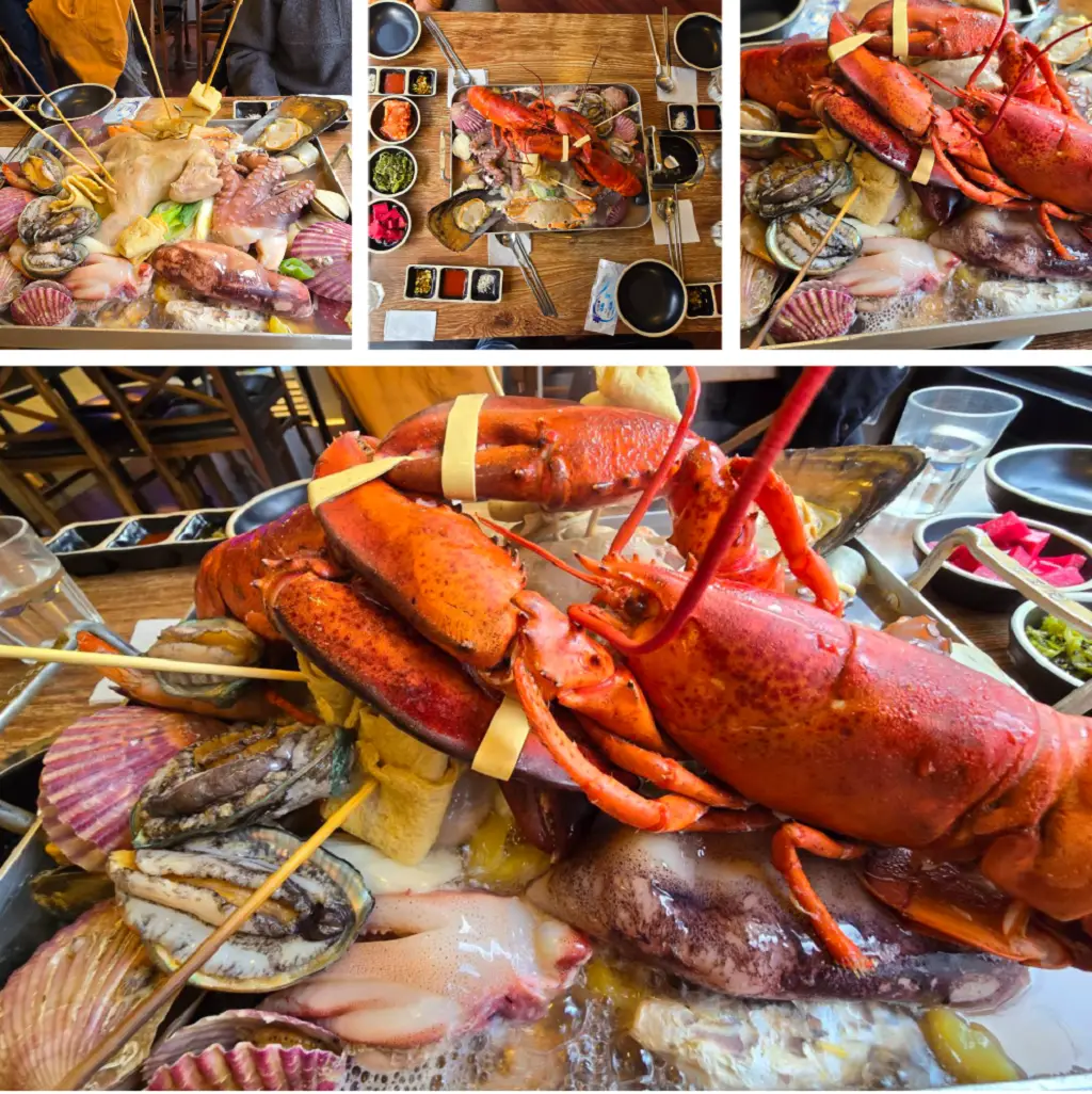 焗烤龍蝦2人一隻+鮑魚+八爪魚+一隻雞+各式海鮮貝類+魚卵飯+韓式拉麵