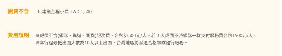 10. 為顧及旅客於出遊期間之人身安全及相關問題,於旅遊行程期間,恕無法接受脫隊之要求;若因此而無法滿足您的旅遊需求,建議您另行選購團體自由行或航空公司套裝自由行。