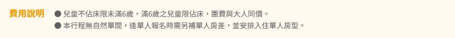 1.報名本產品以雙數為單位,如單人或奇數報名,請於報名時主動告知業務人員,並按房型補足單人房價差,實際價差費用,悉以當團說明公佈為準。