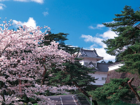 位於弘前市中心,為藩政時代,家主津輕氏代代居住之地。園內的弘前城建於1611年,屬梯郭式平山城,其主建築天守閣雖然在1627年被大火燒毀,卻在1810年得到重建。如時間允許,您可自費上天守閣參觀。逢賞櫻時節,天守閣前遍地盛開2600棵染井吉野櫻、枝垂櫻、八重櫻等,飄逸著櫻花的香氣,醞釀出文字上無法形容的浪漫風情。內外護城河的河堤邊櫻花樹並立,雪白中帶粉嫩的「枝垂櫻」,相映城牆的白、松樹的綠意、完美協和之姿相當動人,尤其當櫻花隨風飄落飛舞空中,「花吹雪」的景象令人終生難忘。